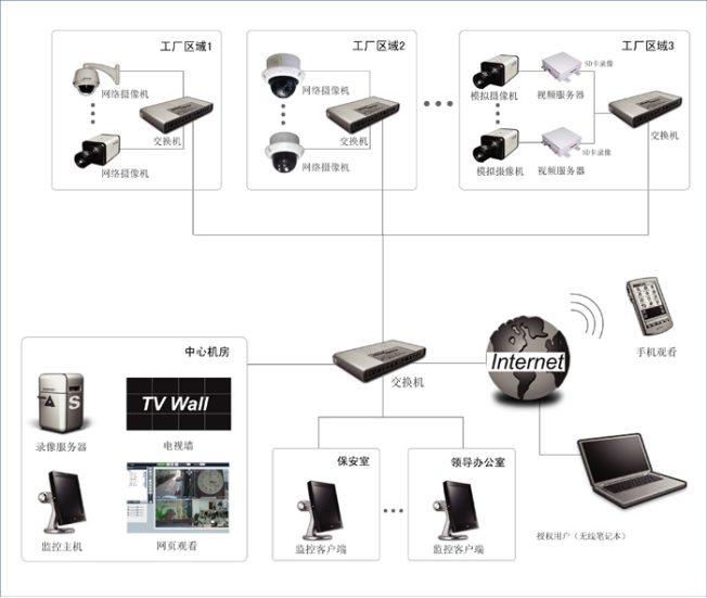 在公司保安部設(shè)立中央監(jiān)控中心,管理公司所有的設(shè)備;在工廠、倉庫、宿舍等地設(shè)立區(qū)域監(jiān)控室,用以管理本地的設(shè)備。